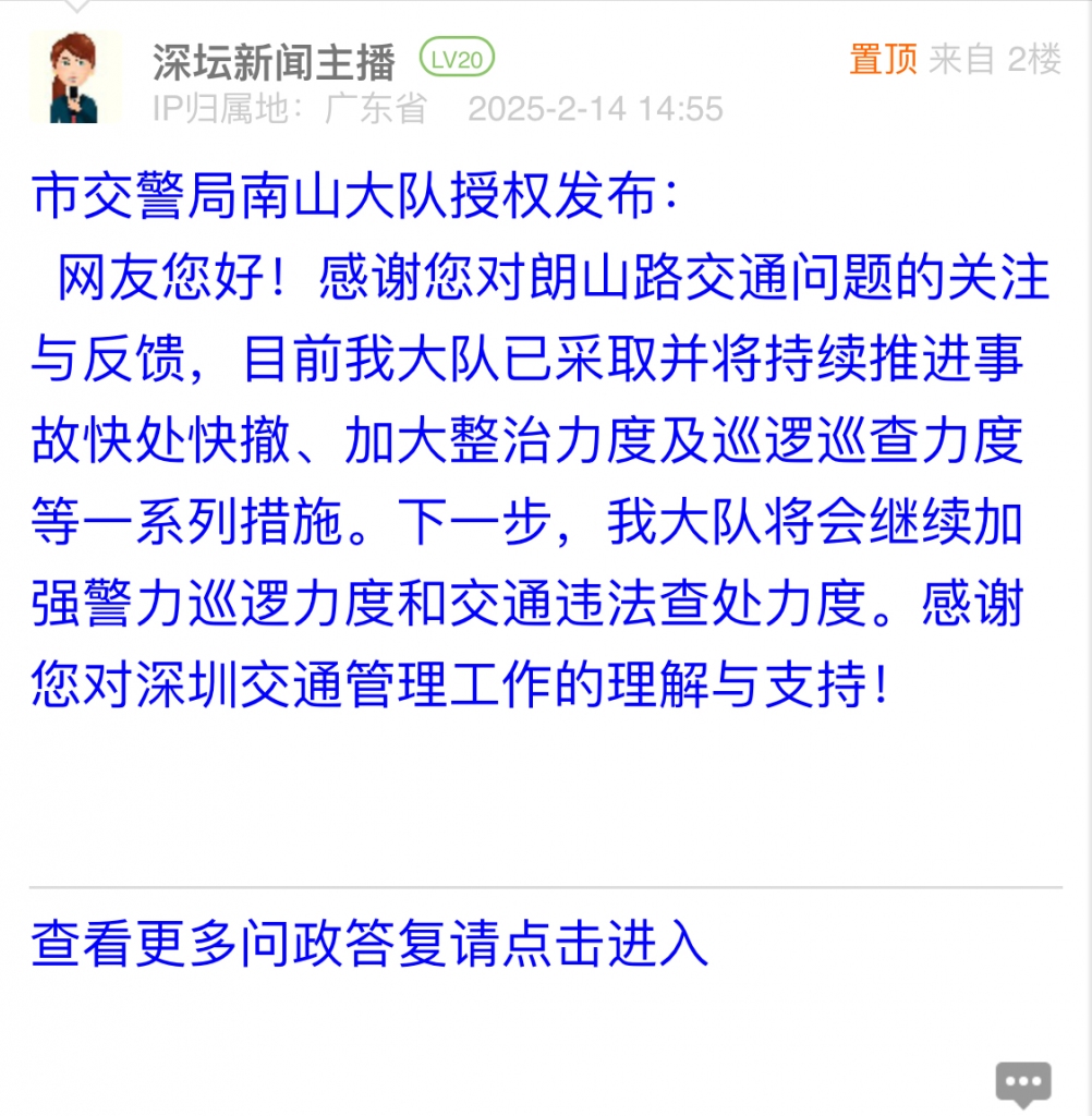 各職能單位如需對網友反映的問題進行回應,可在深圳論壇注冊官方賬號并通過認證,回帖進行回應。