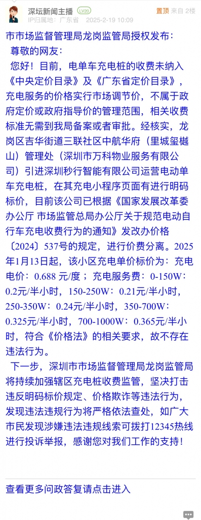 您好!目前,電單車充電樁的收費未納入《中央定價目錄》及《廣東省定價目錄》,充電服務的價格實行市場調節(jié)價,不屬于政府定價或政府指導價的管理范圍,相關收費標準無需到我局備案或者審批。經核實,龍崗區(qū)吉華街道三聯(lián)社區(qū)中航華府(里城璽樾山)管理處(深圳市萬科物業(yè)服務有限公司)引進深圳秒行智能有限公司運營電動單車充電樁,在其充電小程序頁面有進行明碼標價,目前該公司已根據(jù)《國家發(fā)展改革委辦公廳 市場監(jiān)管總局辦公廳關于規(guī)范電動自行車充電收費行為的通知》發(fā)改辦價格〔2024〕537號的規(guī)定,進行價費分離。2025年1月13日起,該小區(qū)充電單價標價為:充電電價:0.688 元/度 ;充電服務費:0-150W:0.2元/半小時,150-250W:0.21元/半小時,250-350W:0.24元/半小時,350-700W:0.325元/半小時,700-1000W:0.365元/半小時,符合《價格法》的相關要求,故不存在違法行為。