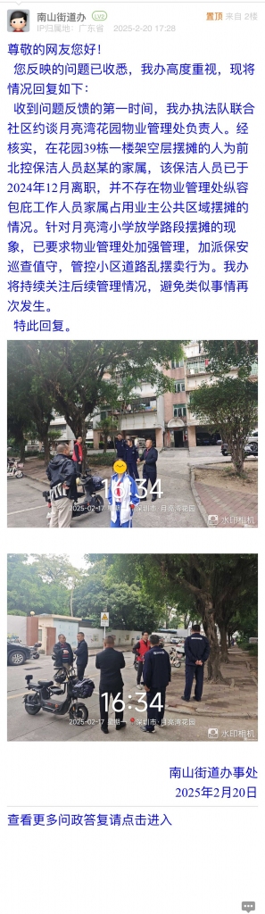 18. 帖文《南山街道月亮灣花園物業(yè)衛(wèi)生人員家屬長期占據(jù)業(yè)主一樓擺攤,物業(yè)管理處不管》