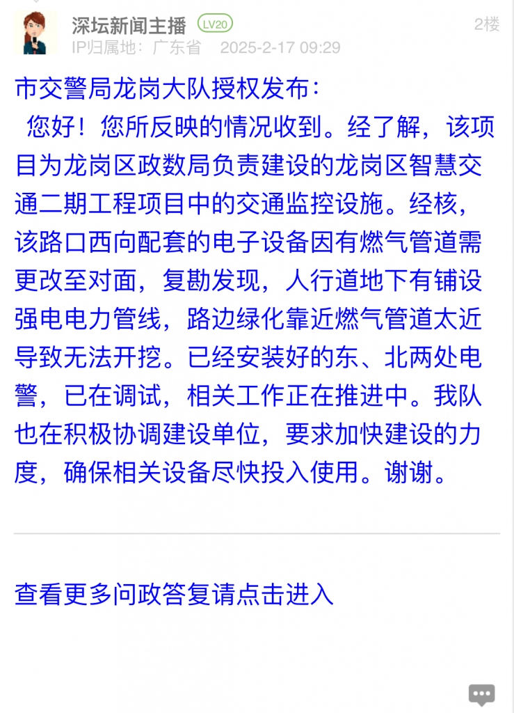 您好!您所反映的情況收到。經了解,該項目為龍崗區(qū)政數(shù)局負責建設的龍崗區(qū)智慧交通二期工程項目中的交通監(jiān)控設施。經核,該路口西向配套的電子設備因有燃氣管道需更改至對面,復勘發(fā)現(xiàn),人行道地下有鋪設強電電力管線,路邊綠化靠近燃氣管道太近導致無法開挖。已經安裝好的東、北兩處電警,已在調試,相關工作正在推進中。我隊也在積極協(xié)調建設單位,要求加快建設的力度,確保相關設備盡快投入使用。謝謝。