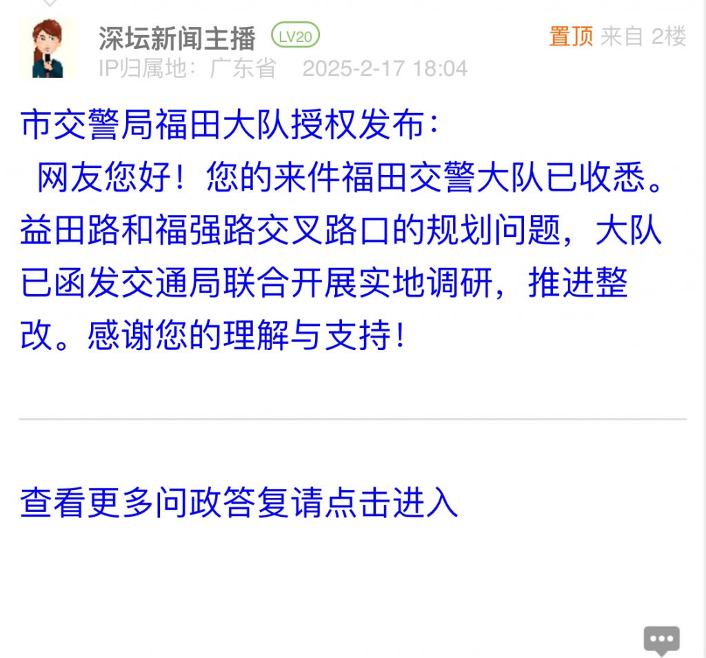 網友您好!您的來件福田交警大隊已收悉。益田路和福強路交叉路口的規(guī)劃問題,大隊已函發(fā)交通局聯(lián)合開展實地調研,推進整改。感謝您的理解與支持!