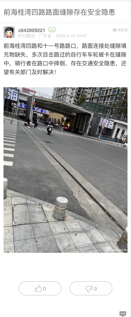 7. 帖文《前海桂灣四路路面縫隙存在安全隱患》