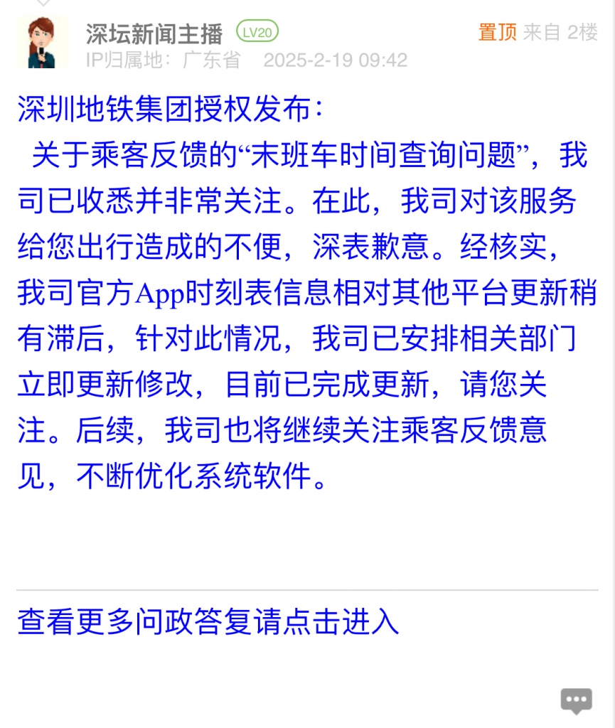 關于乘客反饋的“末班車時間查詢問題”,我司已收悉并非常關注。在此,我司對該服務給您出行造成的不便,深表歉意。經核實,我司官方App時刻表信息相對其他平臺更新稍有滯后,針對此情況,我司已安排相關部門立即更新修改,目前已完成更新,請您關注。后續(xù),我司也將繼續(xù)關注乘客反饋意見,不斷優(yōu)化系統(tǒng)軟件。