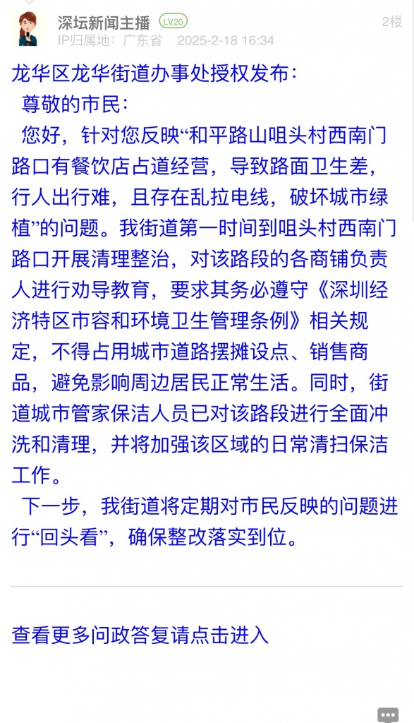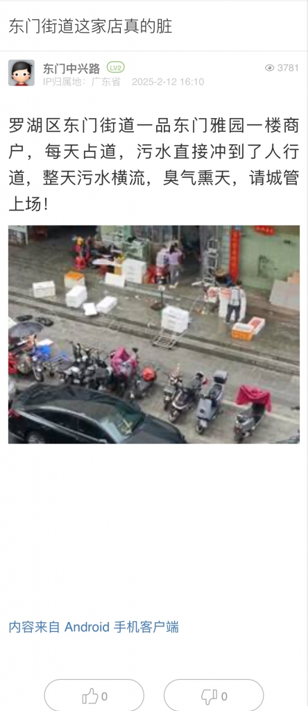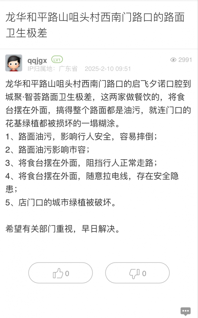 4. 帖文《龍華和平路山咀頭村西南門路口的路面衛(wèi)生極差》