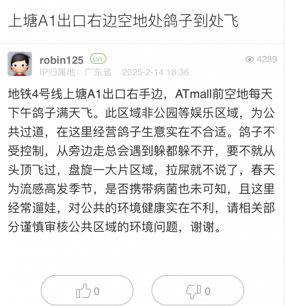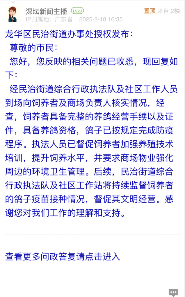 尊敬的市民:您好,您反映的相關問題已收悉,現(xiàn)回復如下:經民治街道綜合行政執(zhí)法隊及社區(qū)工作人員到場向飼養(yǎng)者及商場負責人核實情況,經查,飼養(yǎng)者具備完整的養(yǎng)鴿經營手續(xù)以及證件,具備養(yǎng)鴿資格,鴿子已按規(guī)定完成防疫程序。執(zhí)法人員已督促飼養(yǎng)者加強養(yǎng)殖技術培訓,提升飼養(yǎng)水平,并要求商場物業(yè)強化周邊的環(huán)境衛(wèi)生管理。后續(xù),民治街道綜合行政執(zhí)法隊及社區(qū)工作站將持續(xù)監(jiān)督飼養(yǎng)者的鴿子疫苗接種情況,督促其文明經營。感謝您對我們工作的理解和支持。