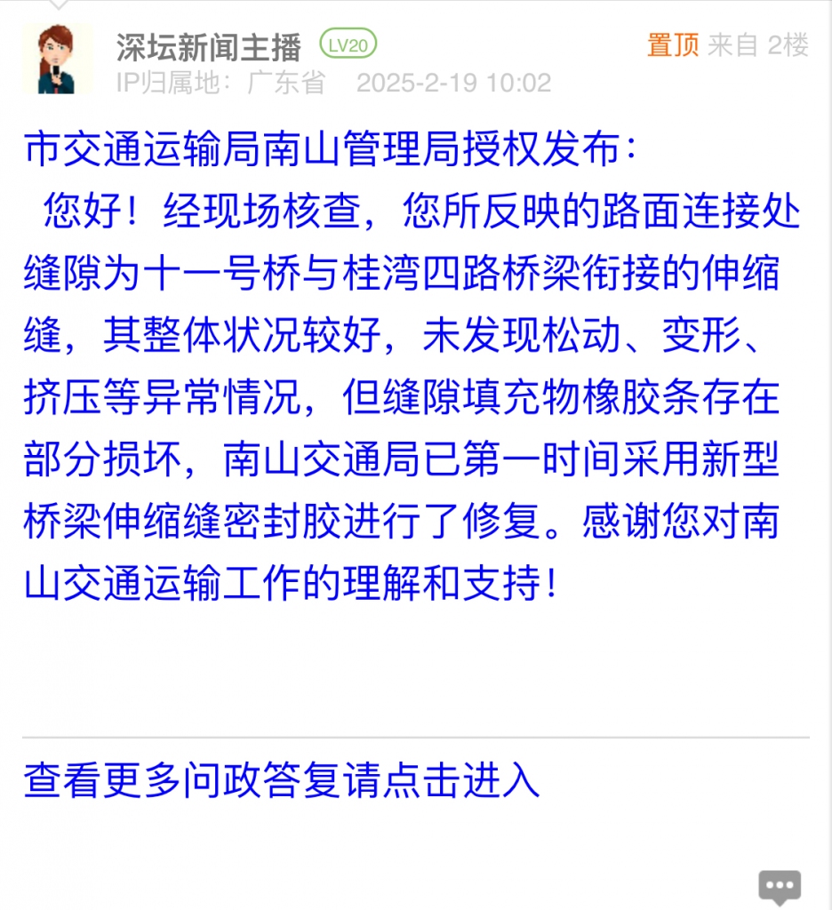 您好!經現(xiàn)場核查,您所反映的路面連接處縫隙為十一號橋與桂灣四路橋梁銜接的伸縮縫,其整體狀況較好,未發(fā)現(xiàn)松動、變形、擠壓等異常情況,但縫隙填充物橡膠條存在部分損壞,南山交通局已第一時間采用新型橋梁伸縮縫密封膠進行了修復。感謝您對南山交通運輸工作的理解和支持!