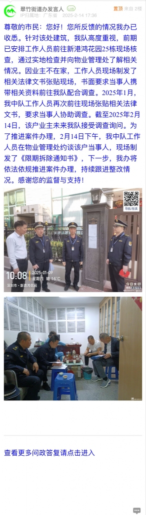 尊敬的市民:您好!您所反饋的情況我辦已收悉。針對該處建筑,我隊高度重視,前期已安排工作人員前往新港鴻花園25棟現(xiàn)場核查,通過實地檢查并向物業(yè)管理處了解相關情況。因業(yè)主不在家,工作人員現(xiàn)場制發(fā)了相關法律文書張貼現(xiàn)場,書面要求當事人攜帶相關資料前往我隊配合調查。2025年1月,我中隊工作人員再次前往現(xiàn)場張貼相關法律文書,要求當事人協(xié)助調查。截至2025年2月14日,該戶業(yè)主未來我隊接受調查詢問。為了推進案件辦理,2月14日下午,我中隊工作人員在物業(yè)管理處約談該戶當事人,現(xiàn)場制發(fā)了《限期拆除通知書》,下一步,我辦將依法依規(guī)推進案件辦理,持續(xù)跟進整改情況。感謝您的監(jiān)督與支持!