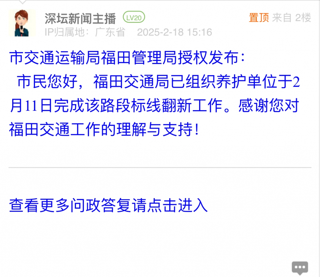 市民您好,福田交通局已組織養(yǎng)護單位于2月11日完成該路段標線翻新工作。感謝您對福田交通工作的理解與支持!