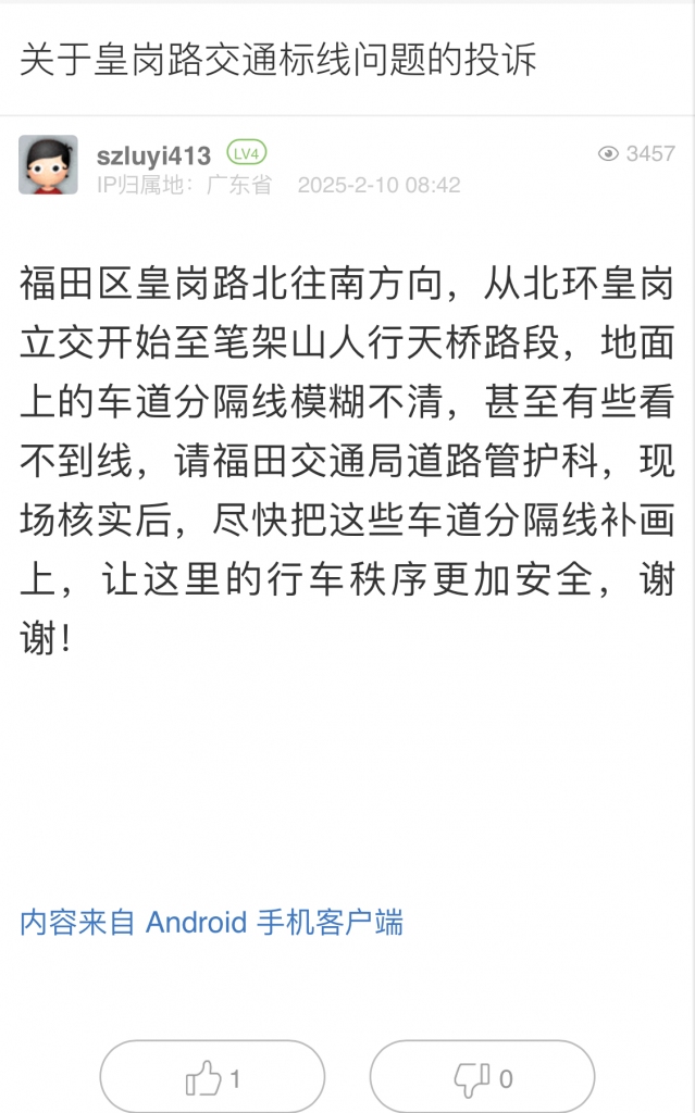 2. 帖文《關于皇崗路交通標線問題的投訴》