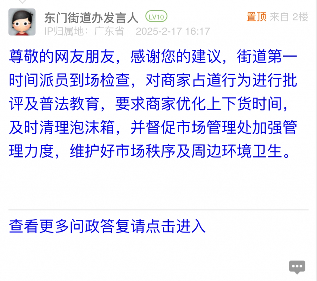 尊敬的網友朋友,感謝您的建議,街道第一時間派員到場檢查,對商家占道行為進行批評及普法教育,要求商家優(yōu)化上下貨時間,及時清理泡沫箱,并督促市場管理處加強管理力度,維護好市場秩序及周邊環(huán)境衛(wèi)生。