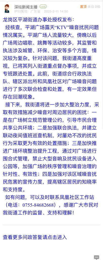 經核查,平湖廣場露天“KTV”噪音擾民問題情況屬實。平湖廣場人流量較大,傍晚以后廣場周邊唱歌、跳舞等活動較多,其監(jiān)管和執(zhí)法涉及城管、環(huán)保、治安等多個方面,情況較為復雜。針對該問題,我街道高度重視,已將其列入街道重點督辦事項,并成立專班跟進處置。此前,街道綜合行政執(zhí)法隊、轄區(qū)派出所和鳳凰社區(qū)對廣場噪音問題進行了多次聯(lián)合檢查和處置,有一定效果但存在回潮現(xiàn)象。