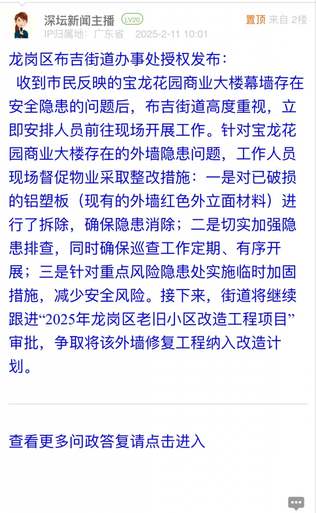 收到市民反映的寶龍花園商業(yè)大樓幕墻存在安全隱患的問題后,布吉街道高度重視,立即安排人員前往現(xiàn)場開展工作。針對寶龍花園商業(yè)大樓存在的外墻隱患問題,工作人員現(xiàn)場督促物業(yè)采取整改措施:一是對已破損的鋁塑板(現(xiàn)有的外墻紅色外立面材料)進行了拆除,確保隱患消除;二是切實加強隱患排查,同時確保巡查工作定期、有序開展;三是針對重點風險隱患處實施臨時加固措施,減少安全風險。接下來,街道將繼續(xù)跟進“2025年龍崗區(qū)老舊小區(qū)改造工程項目”審批,爭取將該外墻修復工程納入改造計劃。