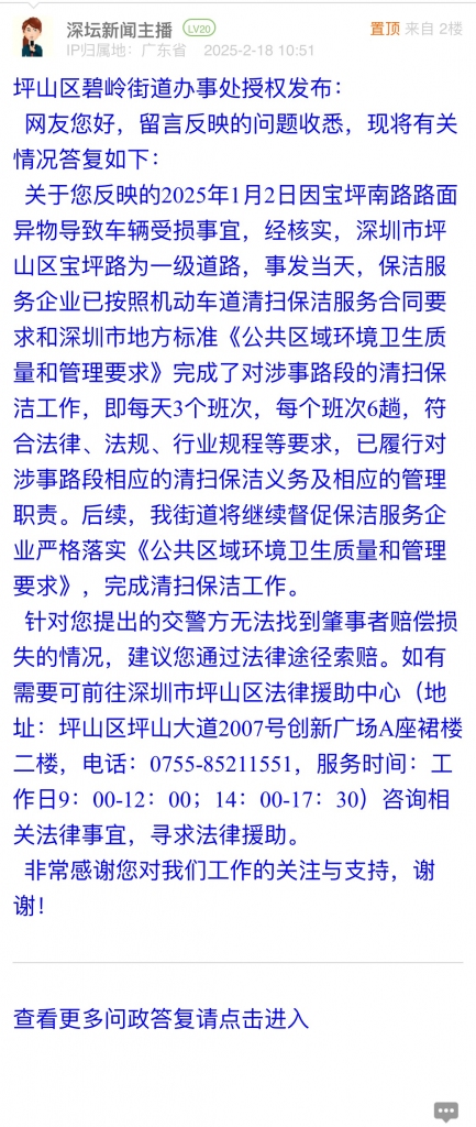 關于您反映的2025年1月2日因寶坪南路路面異物導致車輛受損事宜,經核實,深圳市坪山區(qū)寶坪路為一級道路,事發(fā)當天,保潔服務企業(yè)已按照機動車道清掃保潔服務合同要求和深圳市地方標準《公共區(qū)域環(huán)境衛(wèi)生質量和管理要求》完成了對涉事路段的清掃保潔工作,即每天3個班次,每個班次6趟,符合法律、法規(guī)、行業(yè)規(guī)程等要求,已履行對涉事路段相應的清掃保潔義務及相應的管理職責。后續(xù),我街道將繼續(xù)督促保潔服務企業(yè)嚴格落實《公共區(qū)域環(huán)境衛(wèi)生質量和管理要求》,完成清掃保潔工作。