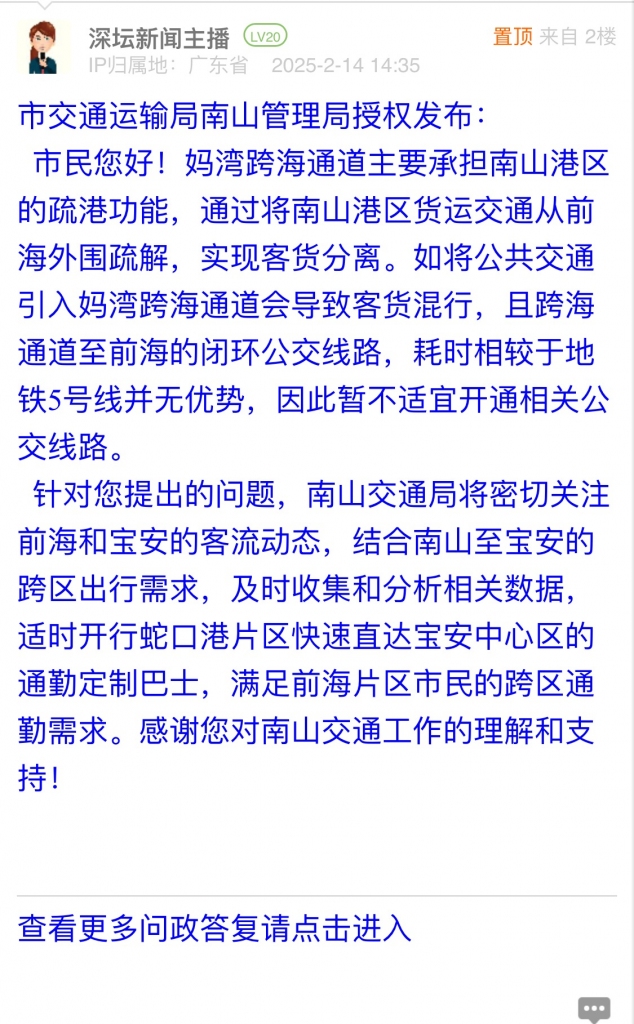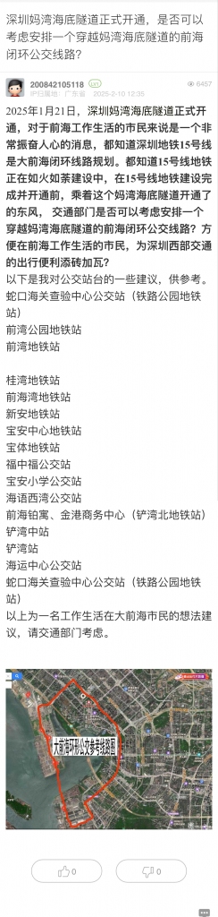 6. 帖文《深圳媽灣海底隧道正式開通,是否可以考慮安排一個穿越媽灣海底隧道的前海閉環(huán)公交線路?》