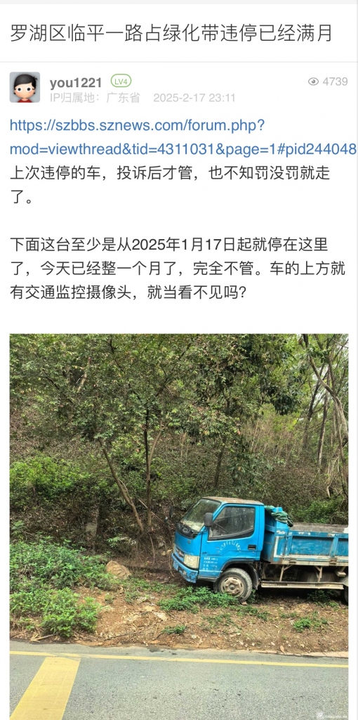 3. 帖文《羅湖區(qū)臨平一路占綠化帶違停已經(jīng)滿月》