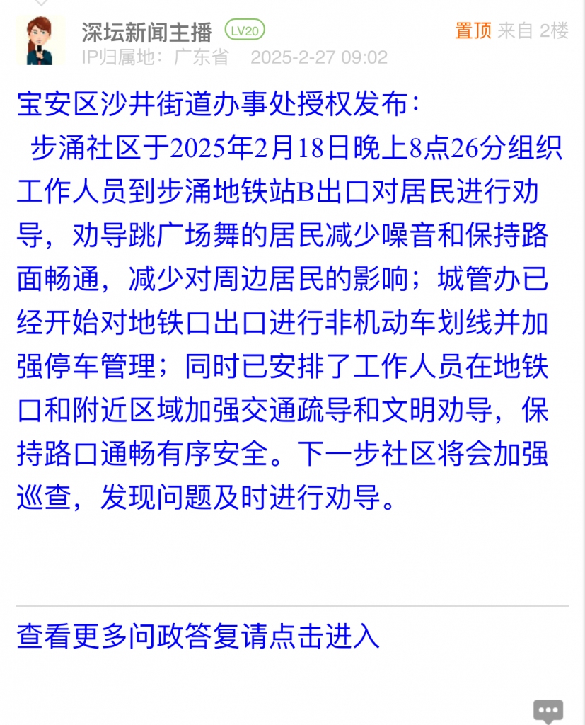 步涌社區(qū)于2025年2月18日晚上8點(diǎn)26分組織工作人員到步涌地鐵站B出口對居民進(jìn)行勸導(dǎo),勸導(dǎo)跳廣場舞的居民減少噪音和保持路面暢通,減少對周邊居民的影響;城管辦已經(jīng)開始對地鐵口出口進(jìn)行非機(jī)動車劃線并加強(qiáng)停車管理;同時已安排了工作人員在地鐵口和附近區(qū)域加強(qiáng)交通疏導(dǎo)和文明勸導(dǎo),保持路口通暢有序安全。下一步社區(qū)將會加強(qiáng)巡查,發(fā)現(xiàn)問題及時進(jìn)行勸導(dǎo)。