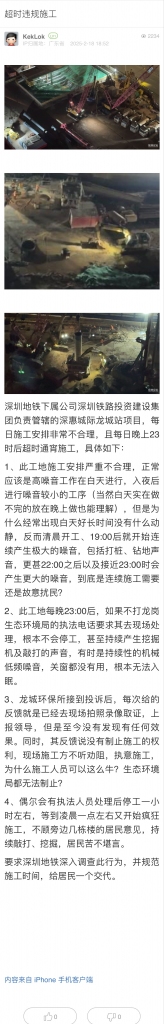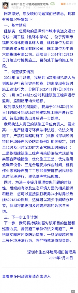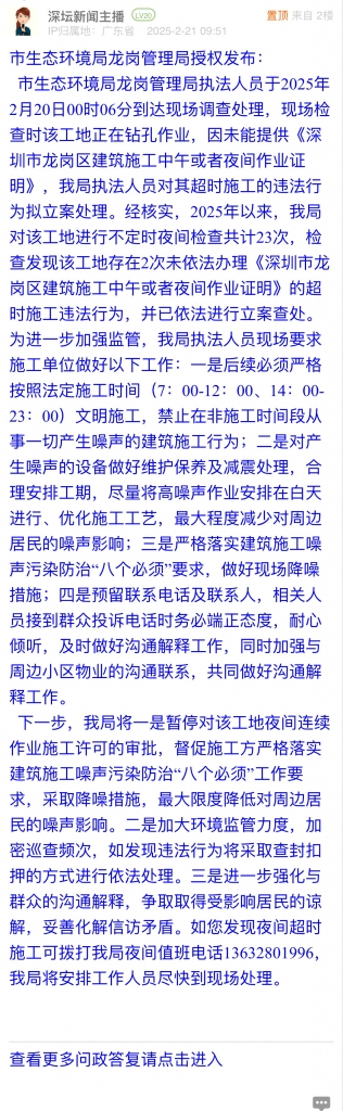 市生態(tài)環(huán)境局龍崗管理局執(zhí)法人員于2025年2月20日00時06分到達(dá)現(xiàn)場調(diào)查處理,現(xiàn)場檢查時該工地正在鉆孔作業(yè),因未能提供《深圳市龍崗區(qū)建筑施工中午或者夜間作業(yè)證明》,我局執(zhí)法人員對其超時施工的違法行為擬立案處理。經(jīng)核實(shí),2025年以來,我局對該工地進(jìn)行不定時夜間檢查共計(jì)23次,檢查發(fā)現(xiàn)該工地存在2次未依法辦理《深圳市龍崗區(qū)建筑施工中午或者夜間作業(yè)證明》的超時施工違法行為,并已依法進(jìn)行立案查處。為進(jìn)一步加強(qiáng)監(jiān)管,我局執(zhí)法人員現(xiàn)場要求施工單位做好以下工作:一是后續(xù)必須嚴(yán)格按照法定施工時間(7:00-12:00、14:00-23:00)文明施工,禁止在非施工時間段從事一切產(chǎn)生噪聲的建筑施工行為;二是對產(chǎn)生噪聲的設(shè)備做好維護(hù)保養(yǎng)及減震處理,合理安排工期,盡量將高噪聲作業(yè)安排在白天進(jìn)行、優(yōu)化施工工藝,最大程度減少對周邊居民的噪聲影響;三是嚴(yán)格落實(shí)建筑施工噪聲污染防治“八個必須”要求,做好現(xiàn)場降噪措施;四是預(yù)留聯(lián)系電話及聯(lián)系人,相關(guān)人員接到群眾投訴電話時務(wù)必端正態(tài)度,耐心傾聽,及時做好溝通解釋工作,同時加強(qiáng)與周邊小區(qū)物業(yè)的溝通聯(lián)系,共同做好溝通解釋工作。