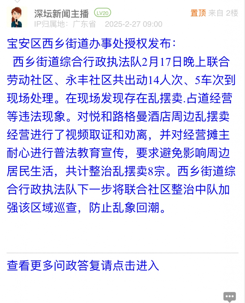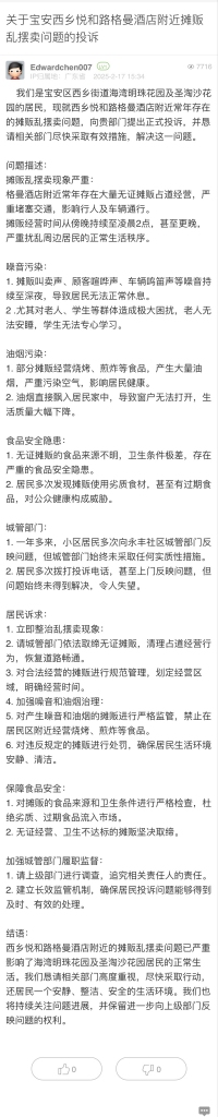 21. 帖文《關(guān)于寶安西鄉(xiāng)悅和路格曼酒店附近攤販亂擺賣問題的投訴》