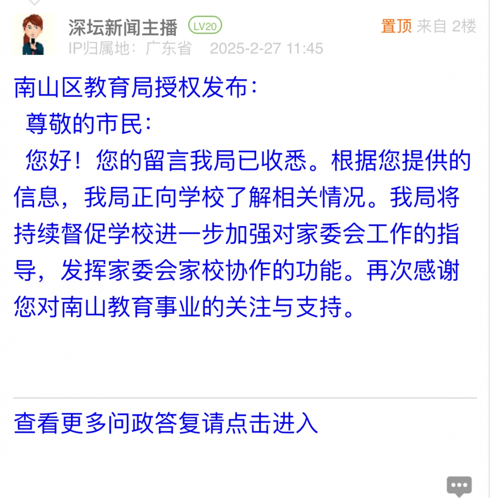 您好!您的留言我局已收悉。根據(jù)您提供的信息,我局正向?qū)W校了解相關(guān)情況。我局將持續(xù)督促學(xué)校進(jìn)一步加強(qiáng)對家委會工作的指導(dǎo),發(fā)揮家委會家校協(xié)作的功能。再次感謝您對南山教育事業(yè)的關(guān)注與支持。