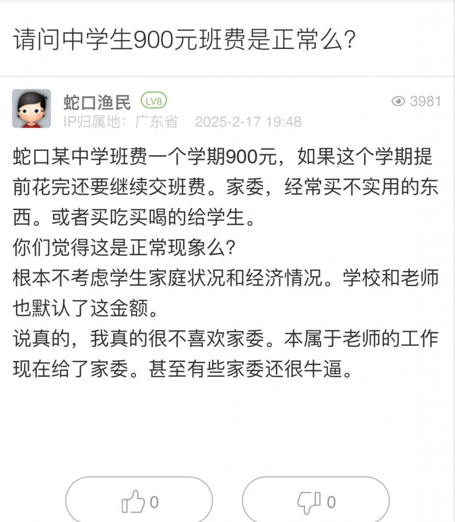 24. 帖文《請問中學(xué)生900元班費(fèi)是正常么?》