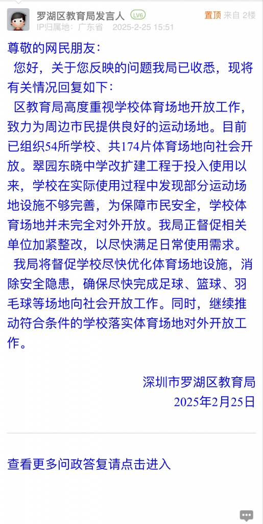 區(qū)教育局高度重視學(xué)校體育場地開放工作,致力為周邊市民提供良好的運(yùn)動場地。目前已組織54所學(xué)校、共174片體育場地向社會開放。翠園東曉中學(xué)改擴(kuò)建工程于投入使用以來,學(xué)校在實(shí)際使用過程中發(fā)現(xiàn)部分運(yùn)動場地設(shè)施不夠完善,為保障市民安全,學(xué)校體育場地并未完全對外開放。我局正督促相關(guān)單位加緊整改,以盡快滿足日常使用需求。