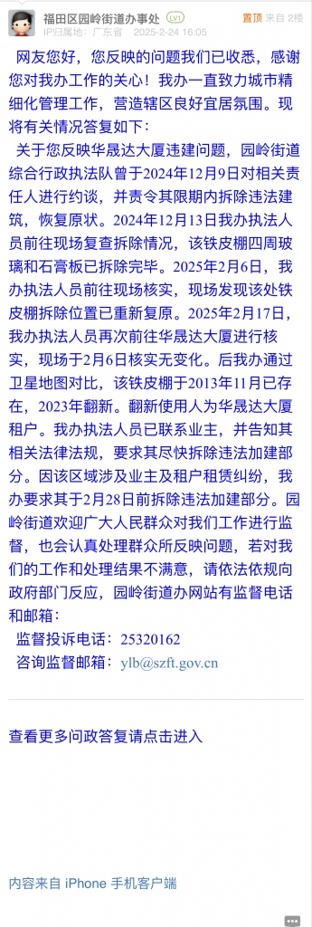 關(guān)于您反映華晟達(dá)大廈違建問題,園嶺街道綜合行政執(zhí)法隊(duì)曾于2024年12月9日對相關(guān)責(zé)任人進(jìn)行約談,并責(zé)令其限期內(nèi)拆除違法建筑,恢復(fù)原狀。2024年12月13日我辦執(zhí)法人員前往現(xiàn)場復(fù)查拆除情況,該鐵皮棚四周玻璃和石膏板已拆除完畢。2025年2月6日,我辦執(zhí)法人員前往現(xiàn)場核實(shí),現(xiàn)場發(fā)現(xiàn)該處鐵皮棚拆除位置已重新復(fù)原。2025年2月17日,我辦執(zhí)法人員再次前往華晟達(dá)大廈進(jìn)行核實(shí),現(xiàn)場于2月6日核實(shí)無變化。后我辦通過衛(wèi)星地圖對比,該鐵皮棚于2013年11月已存在,2023年翻新。翻新使用人為華晟達(dá)大廈租戶。我辦執(zhí)法人員已聯(lián)系業(yè)主,并告知其相關(guān)法律法規(guī),要求其盡快拆除違法加建部分。因該區(qū)域涉及業(yè)主及租戶租賃糾紛,我辦要求其于2月28日前拆除違法加建部分。園嶺街道歡迎廣大人民群眾對我們工作進(jìn)行監(jiān)督,也會認(rèn)真處理群眾所反映問題,若對我們的工作和處理結(jié)果不滿意,請依法依規(guī)向政府部門反應(yīng),園嶺街道辦網(wǎng)站有監(jiān)督電話和郵箱: