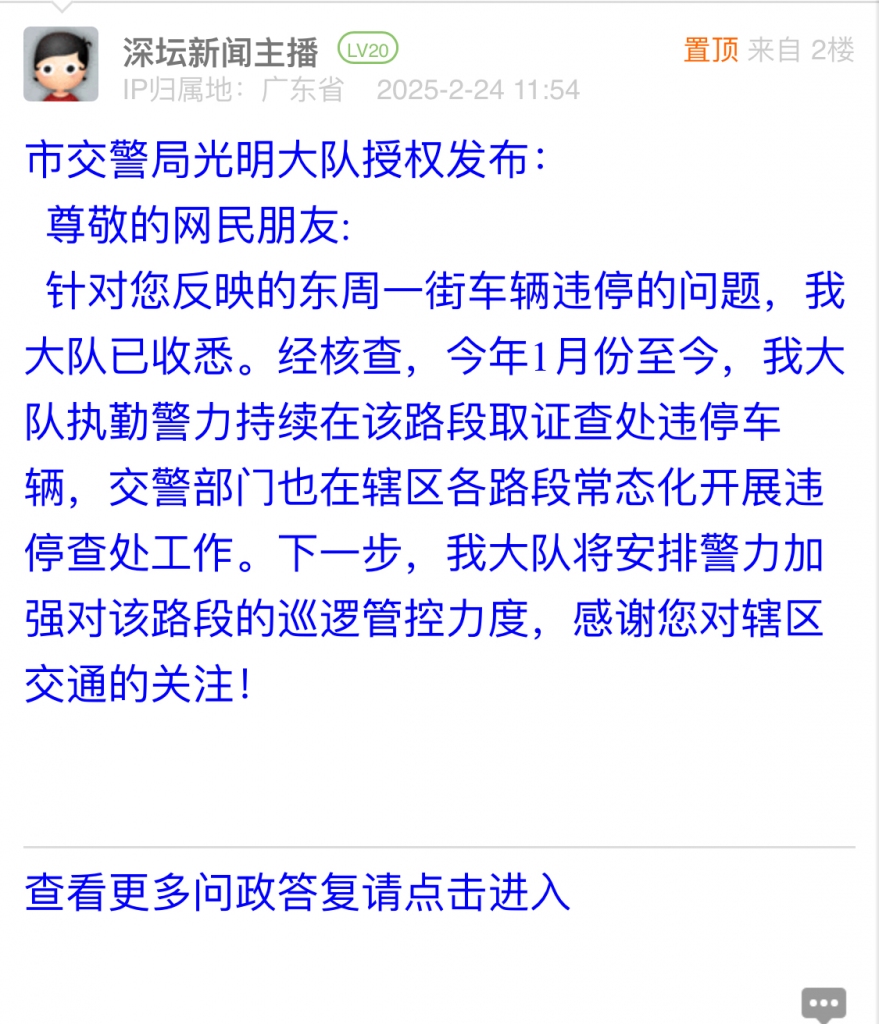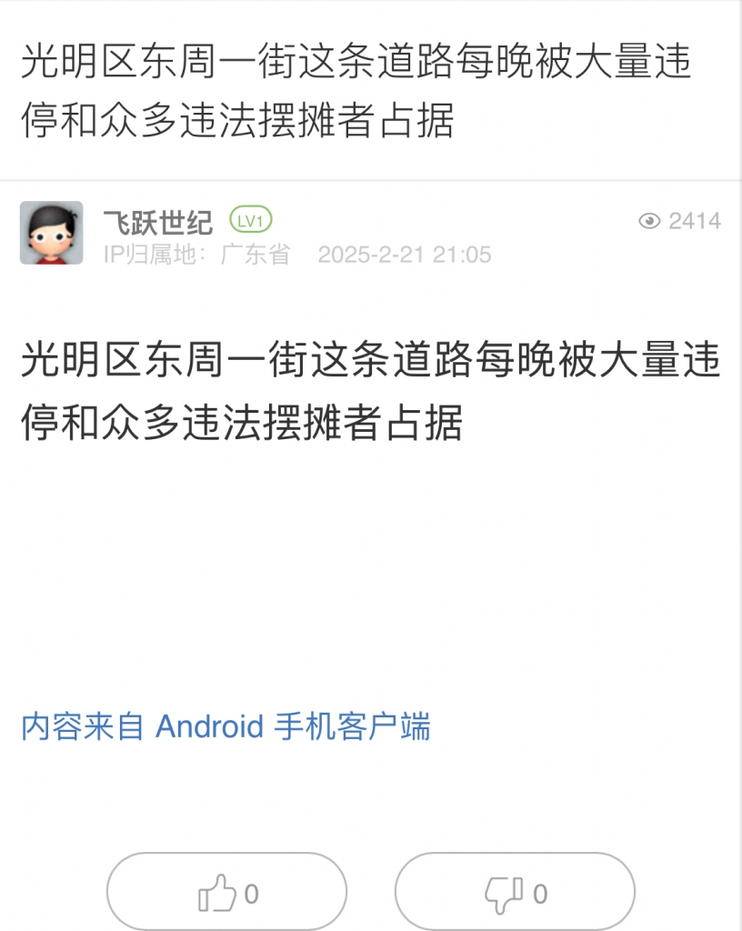 17. 帖文《光明區(qū)東周一街這條道路每晚被大量違停和眾多違法擺攤者占據(jù)》