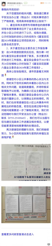 2、關(guān)于嘉寶田業(yè)主委員會工作報(bào)告事宜:自24年底接到居民反應(yīng)后,我辦第一時間與嘉寶田業(yè)委會取得了聯(lián)系,多次要求其盡快進(jìn)行工作報(bào)告。嘉寶田業(yè)委會于2025年1月24日在樓棟公示欄張貼了《嘉寶田花園第六屆業(yè)主委員會2024年度工作報(bào)告》。