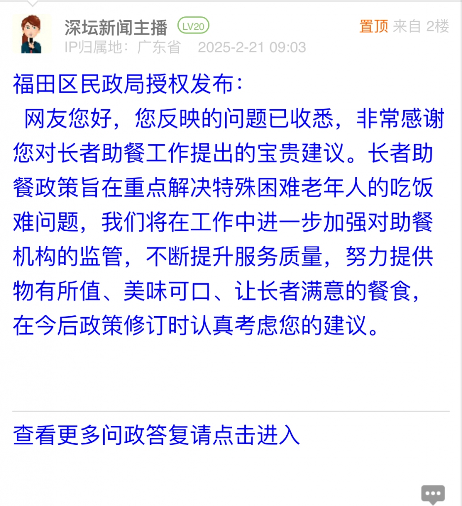 網(wǎng)友您好,您反映的問題已收悉,非常感謝您對長者助餐工作提出的寶貴建議。長者助餐政策旨在重點(diǎn)解決特殊困難老年人的吃飯難問題,我們將在工作中進(jìn)一步加強(qiáng)對助餐機(jī)構(gòu)的監(jiān)管,不斷提升服務(wù)質(zhì)量,努力提供物有所值、美味可口、讓長者滿意的餐食,在今后政策修訂時認(rèn)真考慮您的建議。