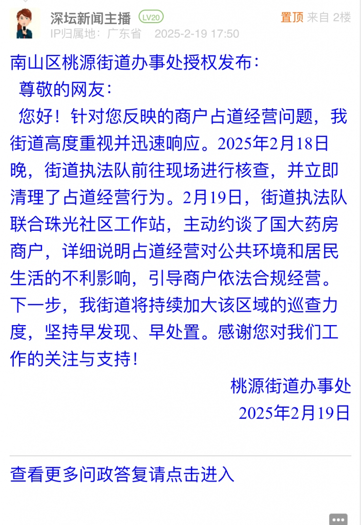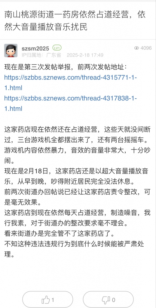 4. 帖文《南山桃源街道一藥房依然占道經(jīng)營,依然大音量播放音樂擾民》