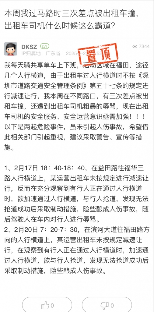 11. 帖文《本周我過馬路時三次差點(diǎn)被出租車撞,出租車司機(jī)什么時候這么霸道?》