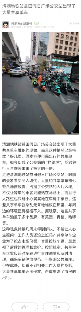 9. 帖文《清湖地鐵站益田假日廣場公交站出現(xiàn)了大量共享單車》