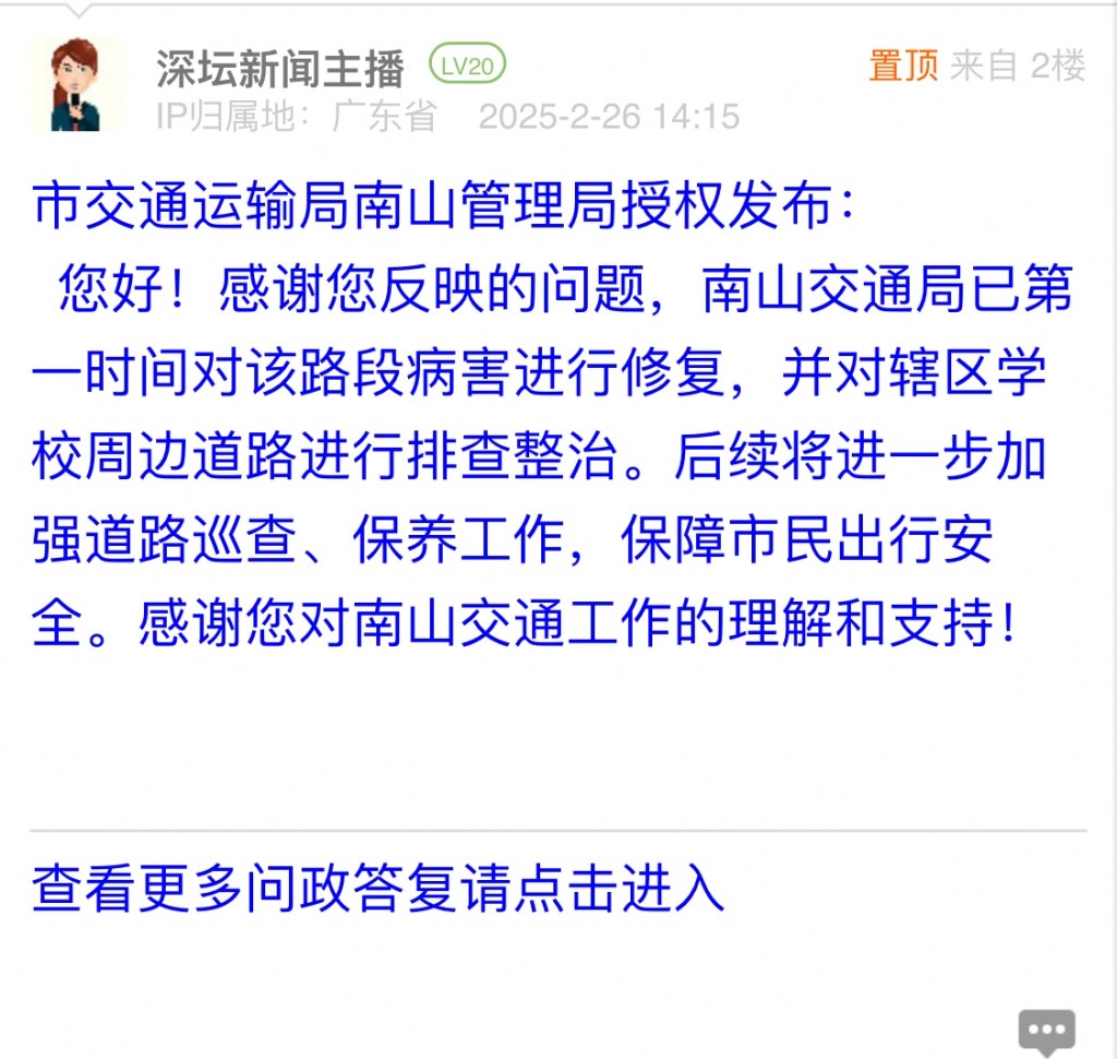 您好!感謝您反映的問題,南山交通局已第一時間對該路段病害進(jìn)行修復(fù),并對轄區(qū)學(xué)校周邊道路進(jìn)行排查整治。后續(xù)將進(jìn)一步加強(qiáng)道路巡查、保養(yǎng)工作,保障市民出行安全。感謝您對南山交通工作的理解和支持!