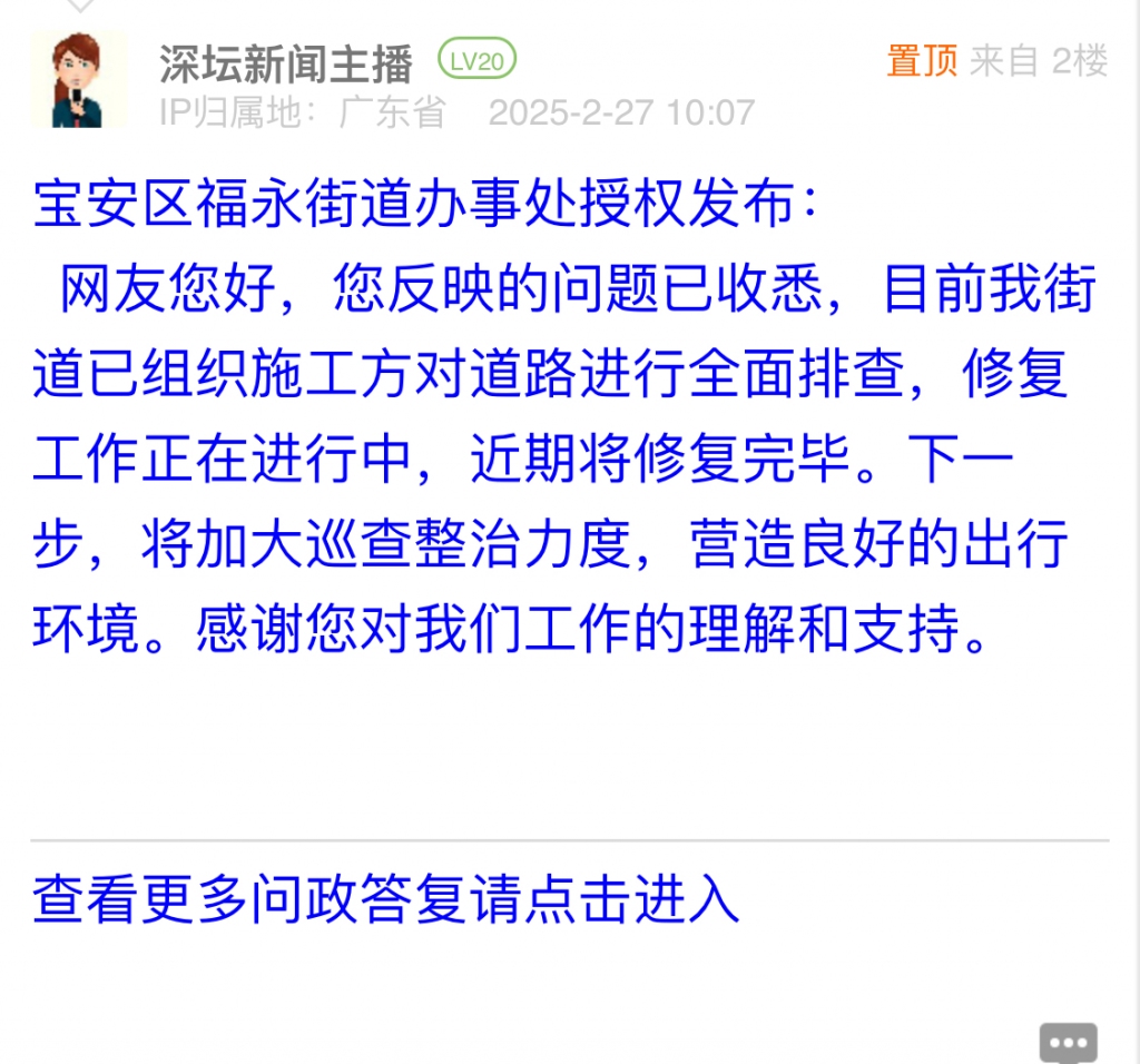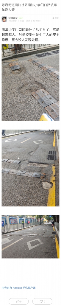 7. 帖文《粵海街道南油社區(qū)南油小學(xué)門口路坑半年沒人管》
