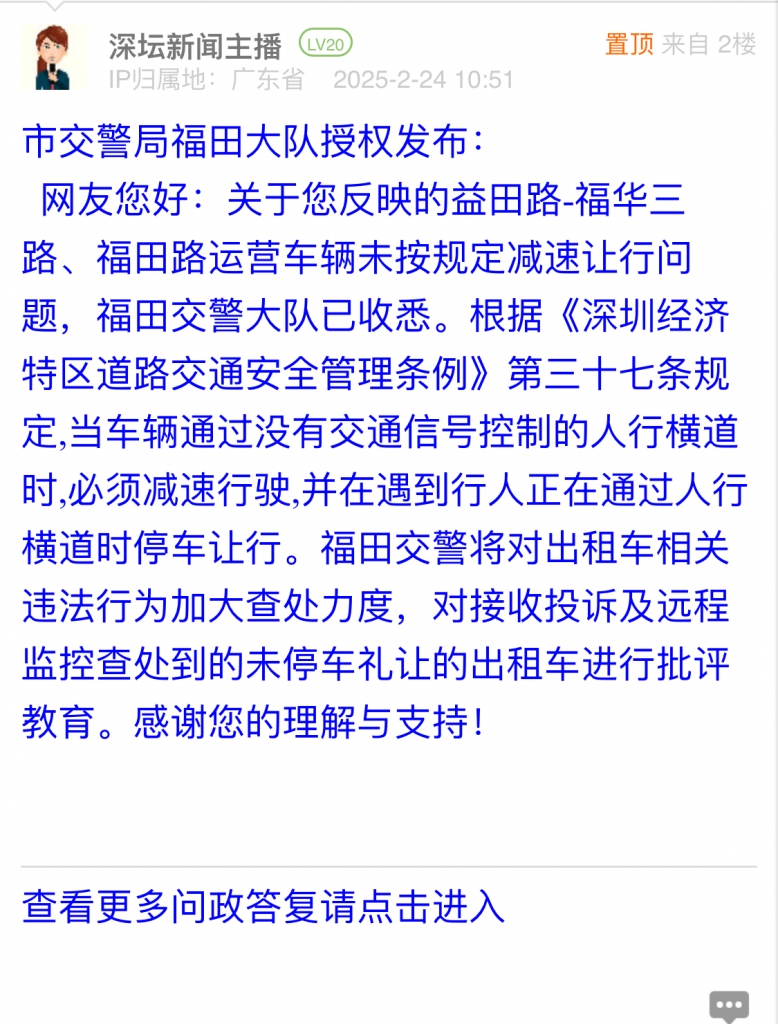 網(wǎng)友您好:關(guān)于您反映的益田路-福華三路、福田路運(yùn)營車輛未按規(guī)定減速讓行問題,福田交警大隊(duì)已收悉。根據(jù)《深圳經(jīng)濟(jì)特區(qū)道路交通安全管理?xiàng)l例》第三十七條規(guī)定,當(dāng)車輛通過沒有交通信號控制的人行橫道時,必須減速行駛,并在遇到行人正在通過人行橫道時停車讓行。福田交警將對出租車相關(guān)違法行為加大查處力度,對接收投訴及遠(yuǎn)程監(jiān)控查處到的未停車禮讓的出租車進(jìn)行批評教育。感謝您的理解與支持!