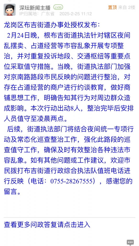 后續(xù),街道執(zhí)法部門將結(jié)合夜間統(tǒng)一專項(xiàng)行動及常態(tài)化巡查整治工作,強(qiáng)化此路段的巡查值守工作,確保及時有效整治各種違法市容亂象。如有其他問題或工作建議,歡迎市民撥打布吉街道行政綜合執(zhí)法隊(duì)值班電話進(jìn)行反映(電話:0755-28267555),感謝您的留言。