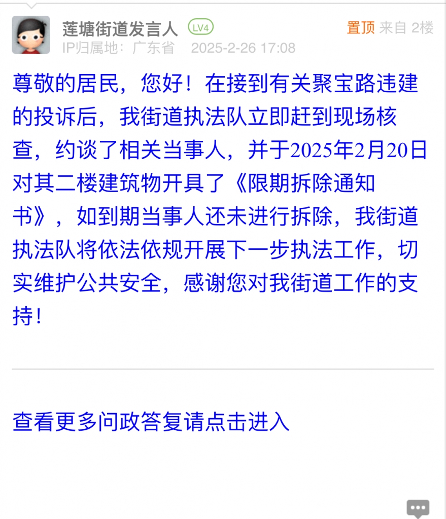 尊敬的居民,您好!在接到有關(guān)聚寶路違建的投訴后,我街道執(zhí)法隊(duì)立即趕到現(xiàn)場核查,約談了相關(guān)當(dāng)事人,并于2025年2月20日對其二樓建筑物開具了《限期拆除通知書》,如到期當(dāng)事人還未進(jìn)行拆除,我街道執(zhí)法隊(duì)將依法依規(guī)開展下一步執(zhí)法工作,切實(shí)維護(hù)公共安全,感謝您對我街道工作的支持!