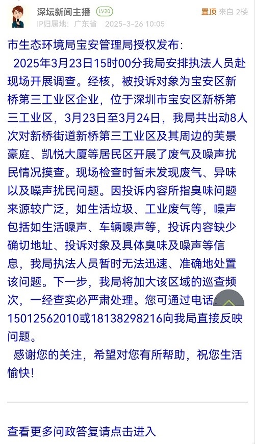 2025年3月23日15時(shí)00分我局安排執(zhí)法人員赴現(xiàn)場(chǎng)開(kāi)展調(diào)查。經(jīng)核,被投訴對(duì)象為寶安區(qū)新橋第三工業(yè)區(qū)企業(yè),位于深圳市寶安區(qū)新橋第三工業(yè)區(qū),3月23日至3月24日,我局共出動(dòng)8人次對(duì)新橋街道新橋第三工業(yè)區(qū)及其周邊的芙景豪庭、凱悅大廈等居民區(qū)開(kāi)展了廢氣及噪聲擾民情況摸查。現(xiàn)場(chǎng)檢查時(shí)暫未發(fā)現(xiàn)廢氣、異味以及噪聲擾民問(wèn)題。因投訴內(nèi)容所指臭味問(wèn)題來(lái)源較廣泛,如生活垃圾、工業(yè)廢氣等,噪聲包括如生活噪聲、車(chē)輛噪聲等,投訴內(nèi)容缺少確切地址、投訴對(duì)象及具體臭味及噪聲等信息,我局執(zhí)法人員暫時(shí)無(wú)法迅速、準(zhǔn)確地處置該問(wèn)題。下一步,我局將加大該區(qū)域的巡查頻次,一經(jīng)查實(shí)必嚴(yán)肅處理。您可通過(guò)電話:15012562010或18138298216向我局直接反映問(wèn)題。感謝您的關(guān)注,希望對(duì)您有所幫助,祝您生活愉快!
