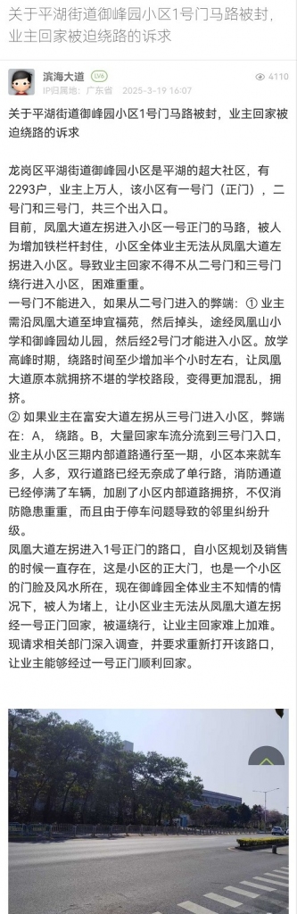 37. 帖文《關(guān)于平湖街道御峰園小區(qū)1號(hào)門(mén)馬路被封,業(yè)主回家被迫繞路的訴求》