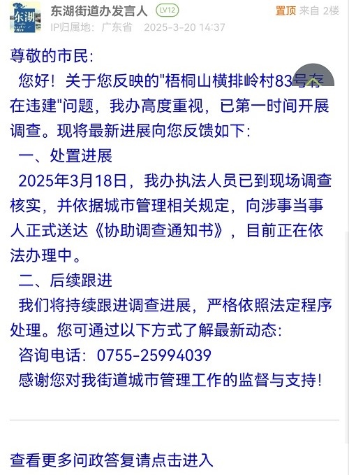 您好!關(guān)于您反映的"梧桐山橫排嶺村83號(hào)存在違建"問(wèn)題,我辦高度重視,已第一時(shí)間開(kāi)展調(diào)查?,F(xiàn)將最新進(jìn)展向您反饋如下: