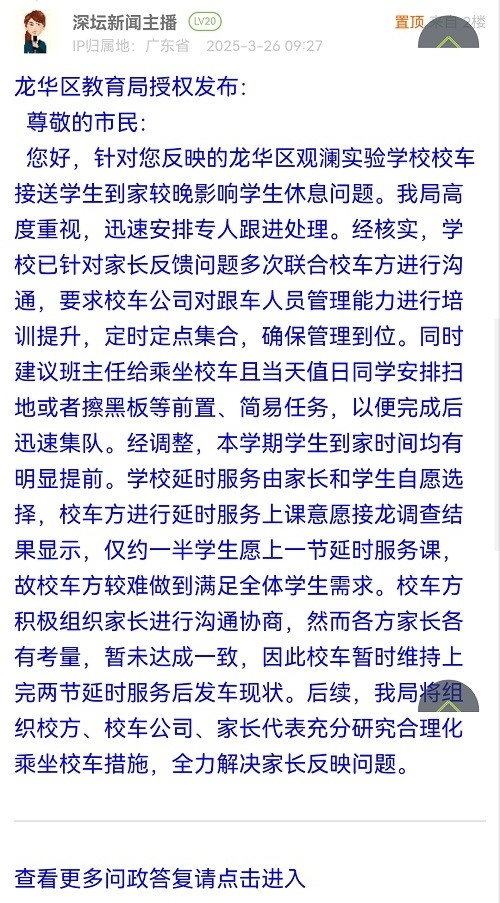 尊敬的市民:您好,針對(duì)您反映的龍華區(qū)觀瀾實(shí)驗(yàn)學(xué)校校車(chē)接送學(xué)生到家較晚影響學(xué)生休息問(wèn)題。我局高度重視,迅速安排專(zhuān)人跟進(jìn)處理。經(jīng)核實(shí),學(xué)校已針對(duì)家長(zhǎng)反饋問(wèn)題多次聯(lián)合校車(chē)方進(jìn)行溝通,要求校車(chē)公司對(duì)跟車(chē)人員管理能力進(jìn)行培訓(xùn)提升,定時(shí)定點(diǎn)集合,確保管理到位。同時(shí)建議班主任給乘坐校車(chē)且當(dāng)天值日同學(xué)安排掃地或者擦黑板等前置、簡(jiǎn)易任務(wù),以便完成后迅速集隊(duì)。經(jīng)調(diào)整,本學(xué)期學(xué)生到家時(shí)間均有明顯提前。學(xué)校延時(shí)服務(wù)由家長(zhǎng)和學(xué)生自愿選擇,校車(chē)方進(jìn)行延時(shí)服務(wù)上課意愿接龍調(diào)查結(jié)果顯示,僅約一半學(xué)生愿上一節(jié)延時(shí)服務(wù)課,故校車(chē)方較難做到滿足全體學(xué)生需求。校車(chē)方積極組織家長(zhǎng)進(jìn)行溝通協(xié)商,然而各方家長(zhǎng)各有考量,暫未達(dá)成一致,因此校車(chē)暫時(shí)維持上完兩節(jié)延時(shí)服務(wù)后發(fā)車(chē)現(xiàn)狀。后續(xù),我局將組織校方、校車(chē)公司、家長(zhǎng)代表充分研究合理化乘坐校車(chē)措施,全力解決家長(zhǎng)反映問(wèn)題。