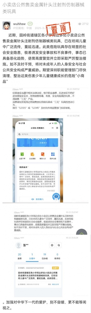 網(wǎng)友您好,您反映的問(wèn)題我們已收悉,感謝您對(duì)我辦工作的關(guān)心!我辦一直致力于推動(dòng)未成年人保護(hù)工作,營(yíng)造一個(gè)更加安全、廣闊的成長(zhǎng)環(huán)境?,F(xiàn)將有關(guān)情況答復(fù)如下:關(guān)于您反映園嶺街道小學(xué)周邊售賣(mài)金屬針頭注射劑仿制器械類(lèi)玩具問(wèn)題,深圳市市場(chǎng)監(jiān)督管理局福田監(jiān)管局已組織執(zhí)法人員對(duì)轄區(qū)校園周邊商鋪進(jìn)行排查。同時(shí),園嶺街道綜合行政執(zhí)法隊(duì)對(duì)各小學(xué)周邊商鋪、報(bào)刊亭、小賣(mài)部、流動(dòng)攤販等開(kāi)展現(xiàn)場(chǎng)排查,現(xiàn)場(chǎng)暫未發(fā)現(xiàn)有發(fā)現(xiàn)售賣(mài)金屬針頭注射劑仿制器械類(lèi)存在安全隱患玩具情況。針對(duì)此類(lèi)問(wèn)題,園嶺街道婦聯(lián)已將相關(guān)情況通報(bào)轄區(qū)學(xué)校,并發(fā)動(dòng)社區(qū)、管理處提醒轄區(qū)居民無(wú)證玩具的危害性,防止不合格兒童玩具危害兒童的身體健康。下一步,園嶺街道將加大宣傳力度,并提醒居民發(fā)現(xiàn)此類(lèi)物品后撥打深圳市市場(chǎng)監(jiān)督管理局福田監(jiān)管局投訴電話:12315進(jìn)行舉報(bào)。園嶺街道歡迎廣大人民群眾對(duì)我們工作進(jìn)行監(jiān)督,也會(huì)認(rèn)真處理群眾所反映問(wèn)題,若對(duì)我們的工作和處理結(jié)果不滿意,請(qǐng)依法依規(guī)向政府部門(mén)反應(yīng),園嶺街道辦網(wǎng)站有監(jiān)督電話和郵箱:監(jiān)督投訴電話:25320162咨詢(xún)監(jiān)督郵箱:ylb@szft.gov.cn