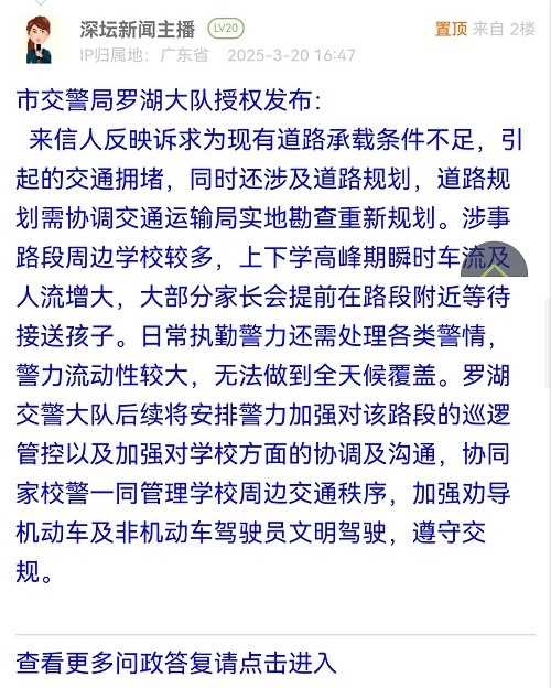 來(lái)信人反映訴求為現(xiàn)有道路承載條件不足,引起的交通擁堵,同時(shí)還涉及道路規(guī)劃,道路規(guī)劃需協(xié)調(diào)交通運(yùn)輸局實(shí)地勘查重新規(guī)劃。涉事路段周邊學(xué)校較多,上下學(xué)高峰期瞬時(shí)車(chē)流及人流增大,大部分家長(zhǎng)會(huì)提前在路段附近等待接送孩子。日常執(zhí)勤警力還需處理各類(lèi)警情,警力流動(dòng)性較大,無(wú)法做到全天候覆蓋。羅湖交警大隊(duì)后續(xù)將安排警力加強(qiáng)對(duì)該路段的巡邏管控以及加強(qiáng)對(duì)學(xué)校方面的協(xié)調(diào)及溝通,協(xié)同家校警一同管理學(xué)校周邊交通秩序,加強(qiáng)勸導(dǎo)機(jī)動(dòng)車(chē)及非機(jī)動(dòng)車(chē)駕駛員文明駕駛,遵守交規(guī)。