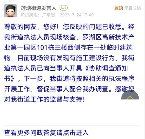 尊敬的網(wǎng)友,您好!您反映的問(wèn)題已收悉。經(jīng)我街道執(zhí)法人員現(xiàn)場(chǎng)核查,羅湖區(qū)高新技術(shù)產(chǎn)業(yè)第一園區(qū)101棟三樓西側(cè)存在一處臨時(shí)建筑物,目前現(xiàn)場(chǎng)沒(méi)有發(fā)現(xiàn)有施工建設(shè)行為,我街道執(zhí)法人員已向當(dāng)事人開(kāi)具《協(xié)助調(diào)查通知書(shū)》。下一步,我街道將按照相關(guān)的執(zhí)法程序開(kāi)展工作,督促當(dāng)事人配合我辦調(diào)查。感謝您對(duì)我街道工作的監(jiān)督與支持!