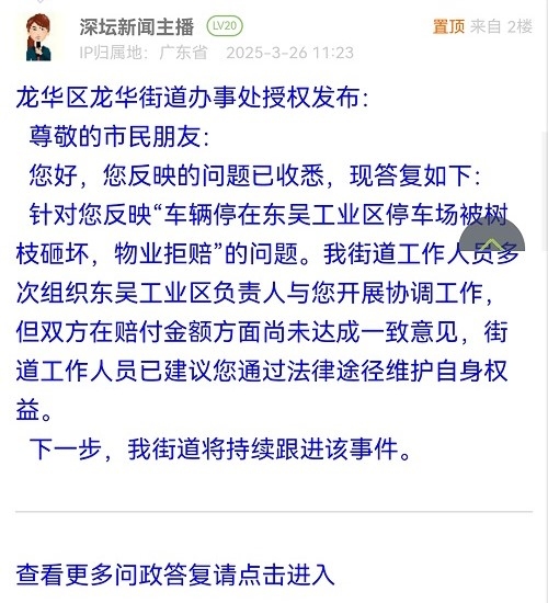 尊敬的市民朋友:您好,您反映的問(wèn)題已收悉,現(xiàn)答復(fù)如下:針對(duì)您反映“車(chē)輛停在東吳工業(yè)區(qū)停車(chē)場(chǎng)被樹(shù)枝砸壞,物業(yè)拒賠”的問(wèn)題。我街道工作人員多次組織東吳工業(yè)區(qū)負(fù)責(zé)人與您開(kāi)展協(xié)調(diào)工作,但雙方在賠付金額方面尚未達(dá)成一致意見(jiàn),街道工作人員已建議您通過(guò)法律途徑維護(hù)自身權(quán)益。下一步,我街道將持續(xù)跟進(jìn)該事件。