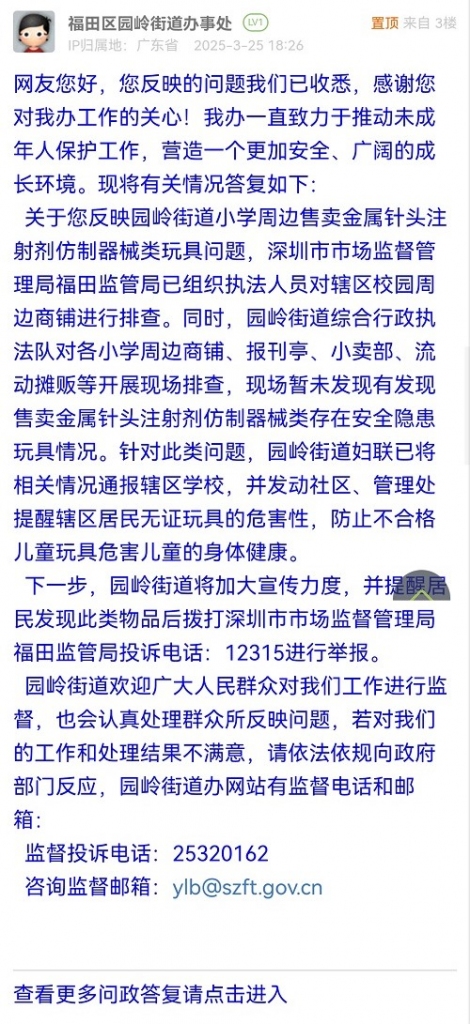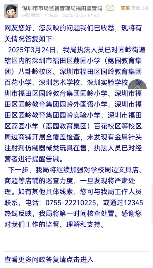 2025年3月24日,我局執(zhí)法人員已對(duì)園嶺街道轄區(qū)內(nèi)的深圳市福田區(qū)荔園小學(xué)(荔園教育集團(tuán))八卦嶺校區(qū)、深圳市福田區(qū)園嶺教育集團(tuán)百花小學(xué)、深圳藝術(shù)學(xué)校、深圳實(shí)驗(yàn)學(xué)校、深圳市福田區(qū)園嶺教育集團(tuán)園嶺小學(xué)、深圳市福田區(qū)園嶺教育集團(tuán)園嶺外國(guó)語(yǔ)小學(xué)、深圳市福田區(qū)園嶺教育集團(tuán)園嶺實(shí)驗(yàn)小學(xué)、深圳市福田區(qū)荔園小學(xué)(荔園教育集團(tuán))百花校區(qū)等校區(qū)周邊商鋪開(kāi)展全覆蓋檢查,未發(fā)現(xiàn)有金屬針頭注射劑仿制器械類(lèi)玩具在售,執(zhí)法人員已對(duì)經(jīng)營(yíng)者進(jìn)行提醒告誡。