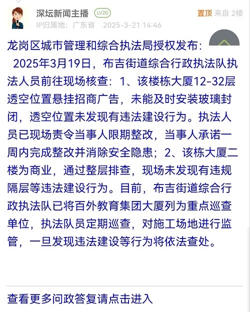2025年3月19日,布吉街道綜合行政執(zhí)法隊(duì)執(zhí)法人員前往現(xiàn)場(chǎng)核查:1、該樓棟大廈12-32層透空位置懸掛招商廣告,未能及時(shí)安裝玻璃封閉,透空位置未發(fā)現(xiàn)有違法建設(shè)行為。執(zhí)法人員已現(xiàn)場(chǎng)責(zé)令當(dāng)事人限期整改,當(dāng)事人承諾一周內(nèi)完成整改并消除安全隱患;2、該棟大廈二樓為商業(yè),通過(guò)整層排查,現(xiàn)場(chǎng)未發(fā)現(xiàn)有違規(guī)隔層等違法建設(shè)行為。目前,布吉街道綜合行政執(zhí)法隊(duì)已將百外教育集團(tuán)大廈列為重點(diǎn)巡查單位,執(zhí)法隊(duì)員定期巡查,對(duì)施工場(chǎng)地進(jìn)行監(jiān)管,一旦發(fā)現(xiàn)違法建設(shè)等行為將依法查處。