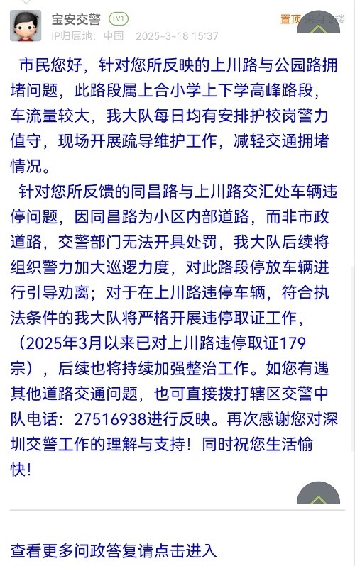 針對(duì)您所反饋的同昌路與上川路交匯處車(chē)輛違停問(wèn)題,因同昌路為小區(qū)內(nèi)部道路,而非市政道路,交警部門(mén)無(wú)法開(kāi)具處罰,我大隊(duì)后續(xù)將組織警力加大巡邏力度,對(duì)此路段停放車(chē)輛進(jìn)行引導(dǎo)勸離;對(duì)于在上川路違停車(chē)輛,符合執(zhí)法條件的我大隊(duì)將嚴(yán)格開(kāi)展違停取證工作,(2025年3月以來(lái)已對(duì)上川路違停取證179宗),后續(xù)也將持續(xù)加強(qiáng)整治工作。如您有遇其他道路交通問(wèn)題,也可直接撥打轄區(qū)交警中隊(duì)電話:27516938進(jìn)行反映。再次感謝您對(duì)深圳交警工作的理解與支持!同時(shí)祝您生活愉快!