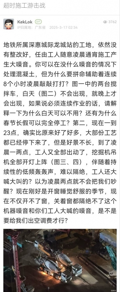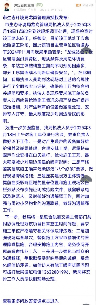 市生態(tài)環(huán)境局龍崗管理局執(zhí)法人員于2025年3月18日1點(diǎn)52分到達(dá)現(xiàn)場(chǎng)調(diào)查處理,現(xiàn)場(chǎng)檢查時(shí)該工地未施工。經(jīng)核實(shí),目前該工地處于應(yīng)急搶險(xiǎn)施工階段,因此該項(xiàng)目主管單位區(qū)軌道辦于2024年11月向我局來(lái)函表示:“龍城站位于我區(qū)巖溶強(qiáng)烈發(fā)育區(qū),地質(zhì)條件及周邊環(huán)境復(fù)雜,車(chē)站主體結(jié)構(gòu)施工期間不可預(yù)見(jiàn)因素多,部分工序需連續(xù)不間斷以確保安全。”。在此期間,我局執(zhí)法人員均到達(dá)現(xiàn)場(chǎng)對(duì)工藝的合規(guī)性進(jìn)行了全面核實(shí)與評(píng)估,確保施工行為符合相關(guān)規(guī)范和要求。執(zhí)法人員現(xiàn)場(chǎng)要求施工單位負(fù)責(zé)人如遇應(yīng)急搶險(xiǎn)施工情況必須嚴(yán)格做好噪聲防治措施,對(duì)產(chǎn)生噪聲的設(shè)備做減震處理,安排專(zhuān)人盯守,最大限度減少對(duì)周邊居民的影響。