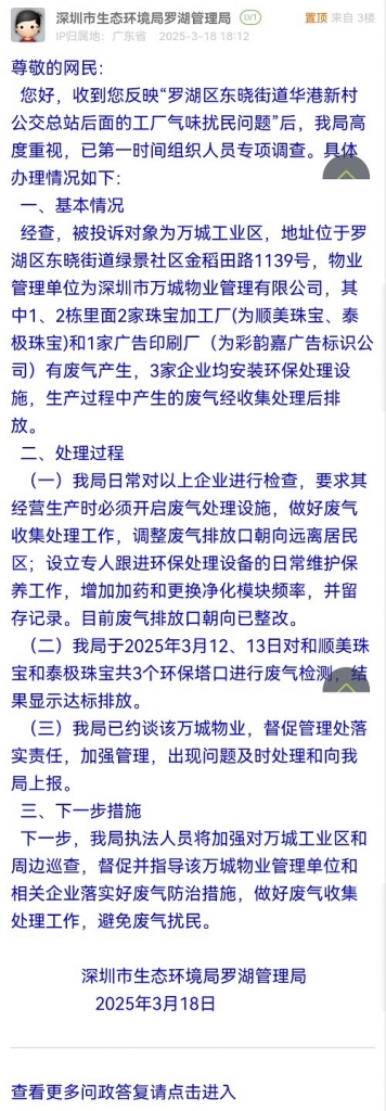 經(jīng)查,被投訴對(duì)象為萬(wàn)城工業(yè)區(qū),地址位于羅湖區(qū)東曉街道綠景社區(qū)金稻田路1139號(hào),物業(yè)管理單位為深圳市萬(wàn)城物業(yè)管理有限公司,其中1、2棟里面2家珠寶加工廠(為順美珠寶、泰極珠寶)和1家廣告印刷廠(為彩韻嘉廣告標(biāo)識(shí)公司)有廢氣產(chǎn)生,3家企業(yè)均安裝環(huán)保處理設(shè)施,生產(chǎn)過(guò)程中產(chǎn)生的廢氣經(jīng)收集處理后排放。